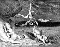 Alichino is one of the devils in the Inferno of Dante Alighieri's Divine Comedy. Alichino is a member of the Malebranche, whose mission is to guard Bolgia Five in the Eighth Circle, the Malebolge. Alichino's name is commonly regarded as a garbled version of the Italian word for harlequin, Arlecchino, perhaps for his flying attempt to catch Ciampolo of Navarre in his escape (see picture). His only significant contribution to the plot is when he persuades the other devils to leave Ciampolo of Navarre alone. Ciampolo is supposed to summon other sinners from the lake of boiling pitch (that don't dare to appear when the devils are near), on request by Dante (who wants to speak with them). But Ciampolo doesn't call at his friends. Instead, he fools the devils and escapes back to the lake, and Alichino tries in vain to catch him. This causes a fight between Alichino and Calcabrina, which causes them to fall into the lake. The other devils put the blame on Virgil and Dante, though and hunt them vexed.