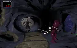 Gameplay in Alien Odyssey is structured over four main sections, each with distinctive action gameplay mechanics.[1] The first section, the 'Forest', is a full motion video shooter played in first person perspective where the player rides a hover bike on a linear path through the forest, and fires at enemies using the cursor. The player has a health and shield bar, and is required to protect their companion, Gaan, from enemy fire. In later sections, the 'Communications Bunker' and 'Armory', players have free movement to explore environments in third person perspective to complete an overarching level objective, such as destroying the reactor of the bunker. To progress, players are required to complete puzzles, such as using terminals to search for keys to unlock security doors. These sections face several obstacles, including floor fans, burning slime, tripwires to trigger guns and lasers, and enemies that wander the levels. Between these levels, players engage in a second action sequence in the 'Mine', a similar where players are able to rotate their ship to avoid oncoming obstacles.[2]