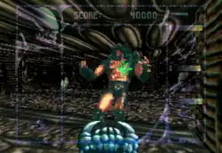 Lewis claimed its gameplay was initially similar to Doom but Hampton felt each playthrough could be more dynamic, handing the level design reins to him and designers at Atari; Andrew Keim, Dan McNamee, Hank Cappa, Hans Jacobsen, and Sean Patten served as co-level designers.[2][17][21][22][23] They came up with the plot and object placement as well as directing the game's flow.[22] Lewis also acted as co-writer along with Chris Hudak.[2] Lewis recalled the Atari staff were given freedom and strived to portray a non-linear feel, designing each level for all three campaigns to allow the player finish the game in various ways.[22] The Colonial Marine is named after Lewis.[22][24][25] The staff was also encouraged to watch the movies for reference.[12] The game runs between 10 and 15 frames per second, with in-game visuals being displayed at a 16-bit color format, while cutscenes and static screens are rendered at a 24-bit color format.[10][9][18] The Jaguar's Blitter and GPU processors are used to draw surfaces and handle calculations respectively.[10] The Alien's AI, dubbed "Alien Chess", was written by Whittaker and its function is to activate enemies when the player approached them.[12]