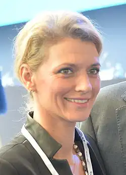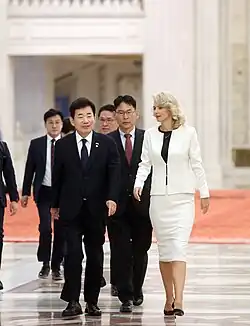 Re-elected in 2012, she was assigned to the judiciary committee.[12] Additionally, as a member of the joint committee tasked with revising the constitution, she advocated that the absentee ballot and a voting age of sixteen be enshrined in the document.[13] In 2013, she joined the Parliamentary Assembly of the Council of Europe.[14] For the second half of 2014, she was the PNL's spokeswoman.[15] In December 2014, PNL president Klaus Iohannis, previously elected President of Romania, resigned from the party prior to taking office, as required under the constitution. Gorghiu ran to succeed him, earning his endorsement in the process. She was elected on a vote of 47 to 28, defeating Ludovic Orban[11] and thus becoming both the party's youngest leader and the first female in the position.[5] In addition to leading the PNL, she was also, alongside Vasile Blaga, the co-president of a revamped PNL that is scheduled to formally merge with the Democratic Liberal Party (PDL) in 2017.[11] Following the PNL's defeat in the 2016 election, Gorghiu resigned as party leader.[16] At the same time, she advanced to the Senate, winning a seat for Timiș County.[17] After the 2020 election, she became one of that body's vice presidents.[18] In June 2022, following the resignation of Florin Cîțu, she became interim Senate President,[19] a position she held for nearly a year.[20]