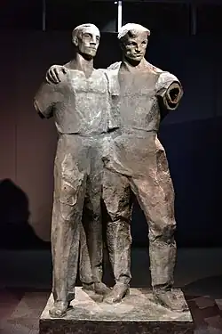 Throughout her career, Szapocznikow explored the fragmented human body through sculptures of bronze and later used modern plastic materials including polyester, polyurethane, and wiring. Influenced by her experiences as a Polish Jewish woman during World War II, she uses the distorted, decaying, and fragmented human body as a witness to wartime experiences, ultimately criticizing the valorization of labor and militarism.[2] Exhumed, from 1955, is a portrayal of the body after war with a pitted surface texture and hollowed torso. The work evokes heroic Herculean figures and victims of the 79 CE Eruption of Mount Vesuvius in Pompeii, further driving the idea that valorized bodies are not immune to the impact of war.[14]