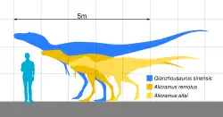 Alioramus (/ˌælioʊˈreɪməs/; meaning 'different branch') is a genus of tyrannosaurid theropod dinosaurs from the Late Cretaceous period of Asia. It currently contains two species. The type species, A. remotus is known from a partial skull and three foot bones recovered from the Mongolian Nemegt Formation, which was deposited in a humid floodplain about 70 million years ago. These remains were named and described by Soviet paleontologist Sergei Kurzanov in 1976. A second species, A. altai, known from a much more complete skeleton also from the Nemegt Formation, was named and described by Stephen L. Brusatte and colleagues in 2009. Its relationships to other tyrannosaurid genera were at first unclear, with some evidence supporting a hypothesis that Alioramus was closely related to the contemporary species Tarbosaurus bataar. However, the discovery of Qianzhousaurus indicates that it belongs to a distinct branch of tyrannosaurs, namely the tribe Alioramini.