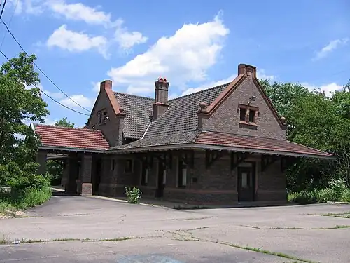 Aliquippa station is a former railway station located in Aliquippa, Pennsylvania, United States. The station was constructed and used by the now defunct Pittsburgh and Lake Erie Railroad (P&LE). Constructed in 1911, the station has also gone by the name of Woodlawn station because of the former town of Woodlawn that was merged with Aliquippa in the late 1870s. After the station closed to passengers, it was used for several years by the Jones and Laughlin Steel Company as an office building.