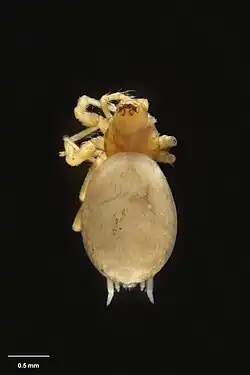 The body is around 2.4 mm (0.094 in) long. The carapace, legs and chelicerae are yellow. The abdomen is cream coloured.[4]