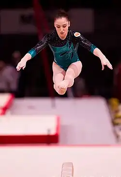 In January it was announced that Mustafina would compete at the Stuttgart World Cup in early March.[108] It was the first time she competed in the all-around in international competition since the Rio Olympics.[109] In March, at the Russian National Championships, Mustafina finished third in the all-around behind Angelina Simakova and Angelina Melnikova.[110] At the Stuttgart World Cup Mustafina finished in fifth place after falling off the balance beam.[111] The following week Mustafina competed at the Birmingham World Cup where she finished first despite falling off the balance beam. After a winning in Birmingham, Mustafina was named to the team to compete at the 2019 European Championships, replacing national champion Simakova who had inconsistent performances in Stuttgart earlier in the month.[112] In April it was announced that Mustafina had withdrawn from the European Championships team[113] in order to focus on preparing for the European Games in June.[114]