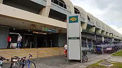 Aljunied was also part of the first batch of ten stations announced in 2010 to have additional bicycle parking facilities as a response to the growing demand of bicycle parking spots.[10] The installation was completed in October 2012.[11] As part of efforts to improve barrier free accessibility for major transport nodes, overhead pedestrian bridges near Aljunied and five other stations had lifts installed.[12][13] They were installed progressively from the third quarter of 2012 to the end of 2013.[14][15] Following a rise in track intrusions as well as commuters slipping when rushing for the train, the LTA and SMRT decided to install platform screen doors.[16] Half-height platform screen doors were eventually installed and commenced operations at Aljunied station by August 2011.[17] The station was installed with high-volume low-speed fans by the first quarter of 2013.[18] In 2018, Aljunied was the temporary terminus for train services during the early closures, late openings and full closures of ten stations in the eastern portion of the East–West Line (EWL), from 5 January to 4 February as a part of works for rail maintenance and checks for the new signalling system.[19][20]