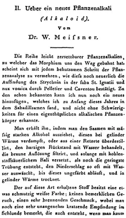 The name "alkaloids" (German: Alkaloide) was introduced in 1819 by German chemist Carl Friedrich Wilhelm Meissner, and is derived from late Latin root alkali and the Greek-language suffix -οειδής -('like').[nb 1] However, the term came into wide use only after the publication of a review article, by Oscar Jacobsen in the chemical dictionary of Albert Ladenburg in the 1880s.[22][23]