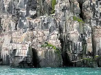 Alkefjellet (‘mount guillemot’) is the nesting location for over 60,000 breeding pairs of Brünnich’s guillemots. The cliffs are made of basalt columns up to100 m high, interspersed with a dark layer – a dolerite intrusion. The molten rock, as it intruded caused the limestone in the contact zone to re-crystalize and form marble.