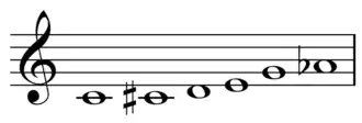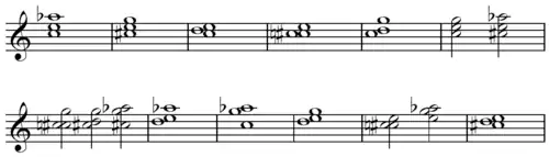 In music, the all-trichord hexachord is a unique hexachord that contains all twelve trichords, or from which all twelve possible trichords may be derived.[2] The prime form of this set class is {012478}[1] and its Forte number is 6-Z17. Its complement is 6-Z43 and they share the interval vector of <3,2,2,3,3,2>.