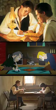![]() Prior to "All About Mormons", the official LDS magazine portrayed the translation process as involving the golden plates (top, 1997). In 2005, South Park depicted the process using a hat (center). By 2017, the same Church publication depicted the translation process, now showing Smith using a hat. | |
