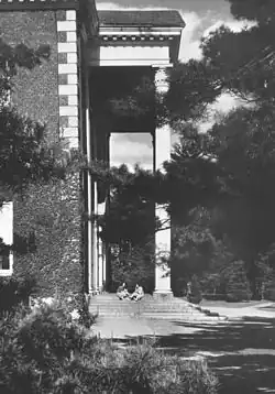 The Students' Building was designed by the New York City architecture firm of McKim, Mead & White,[4][8] representing their only project at Vassar College.[12] The plans were drawn up by young architect Joseph Herenden Clark, a recent graduate of the Columbia School of Architecture who, upon hearing the requirement that the structure be made from brick with white trim and a slate roof, recalled Christ Church in Alexandria, Virginia. Clark had studied Christ Church, which George Washington attended, during his days at Columbia.[2][13] He trekked to Alexandria to study the interior and exterior of the church and ultimately the designs for the Students' Building, his first public plan, were inspired by its architecture and features.[2] Bishop and Company were contracted to construct the Students' Building,[2] an example of the Southern colonial revival style.[14] It sits on the north edge of campus due south of the college's North Gate and southeast of residential quad dorms like Lathrop House.[15] Noyes House was built in 1958 and rests immediately to the southeast of the Students' Building.[15][16]