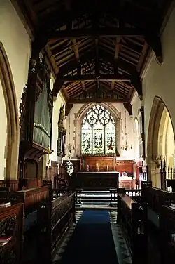 The tower of the church is mainly 15th century, but the nave arcades were built when the Norman style was passing. The old font has a Jacobean cover, there is a fine old chest, and the modern woodwork is richly carved.[3]
