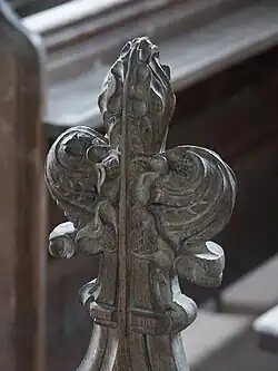 The outlines of the chancel arch are also visible on the inside of the west wall. On each side of it are recesses incorporating re-used 13th-century masonry. In the south wall is a sedilia and in the sanctuary is a piscina, both of which have ogee heads. On the sanctuary floor are Minton tiles.[1] The ceiling dates from the 19th century and is decorated with Latin inscriptions praising the Virgin Mary.[1][2] The font dates from the 15th century and was formerly in a church at Low Toynton in Lincolnshire. It consists of an octagonal bowl with panels containing carvings of angels, other figures, a Tudor rose, and other flowers. The base is also octagonal, and the stem incorporates carvings of saints. At the base of the altar steps is a ledger slab to the memory of a 14th-century priest. This has a Latin inscription around its margin, and is carved with a cross fleury and a chalice.[1]