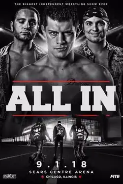 The 2018 All In was an independent professional wrestling pay-per-view (PPV) event promoted by Cody Rhodes and The Young Bucks (Matt Jackson and Nick Jackson) in association with the American promotion Ring of Honor (ROH).[3][4] At the time, Rhodes and the Jacksons had been a part of the Bullet Club of New Japan Pro-Wrestling (NJPW) and ROH. The event took place during Labor Day weekend on Saturday, September 1, 2018, at the Sears Centre Arena in the Chicago suburb of Hoffman Estates, Illinois. The event aired live on traditional PPV outlets, FITE TV, and Honor Club, but it was later made available for on-demand viewing on the NJPW World streaming service.[5] The event included Zero Hour, an hour-long pre-show that aired on WGN America. While independently produced, the event featured wrestlers from ROH, NJPW, Impact Wrestling, Lucha Libre AAA Worldwide, Major League Wrestling, and the National Wrestling Alliance (NWA).