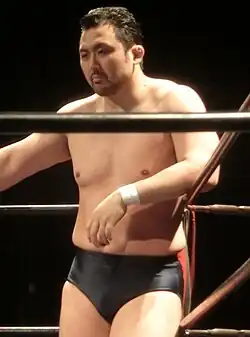 On June 5, 2014, All Japan announced a corporate restructuring taking place on July 1, which would see Jun Akiyama take over as the promotion's new president.[64][65] On July 1, the promotion announced another corporate name change to "All Japan Pro Wrestling kabushiki gaisha" (dropping the Japanese "Zen Nihon Puroresu" name), while also relocating its headquarters from Tokyo to Yokohama.[54] Akiyama established a new company named Zen Nihon Puroresu Innovation, through which he will run the new All Japan Pro Wrestling. Akiyama also serves as the representative director of the promotion and reports to a board of directors, which most notably includes Suwama and Akebono. Motoko Baba also joined the promotion as a consultant.[66][67][68] On September 28, 2015, Go Shiozaki announced his resignation from All Japan.[69] On November 2, it was announced that Akebono was also leaving All Japan with the goal of returning to mixed martial arts.[70] On November 16, yet another wrestler, the reigning World Junior Heavyweight Champion Kotaro Suzuki, announced his departure from All Japan at the end of the month.[71] Four days later, Yoshinobu Kanemaru also announced he would be leaving All Japan following December 15.[72] Akiyama revealed that the departures were all for the same reason: All Japan had recently decided to change all of its wrestler contracts to pay-per-appearance contracts.[73] In October 2016, the promotion announced it had reached a deal with satellite television provider Nippon BS Broadcasting for a monthly highlights show, Eleven, to be broadcast on the third Monday of each month.[74] On November 27, 2016, the promotion returned to Ryōgoku Kokugikan for its first event at the venue in three years, headlined by Kento Miyahara defending the Triple Crown Heavyweight Championship against Suwama.[75] In August 2017 Toryumon Mexico started working with All Japan Pro Wrestling in with a collaborated event tour called Lucha Fiesta.[76] On February 4, 2018, AJPW announced "All Japan Pro Wrestling TV", a new worldwide streaming site for the promotion's events.[77] On October 10, 2019, Akiyama left his position as president to become General Manager.[78] Tsuyoki Fukuda was later made president of AJPW.