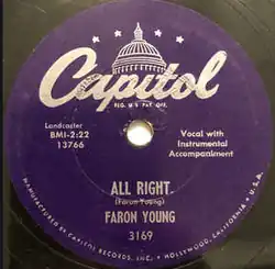 "All Right" is a song written and performed by Faron Young and released on the Capitol label (catalog no. 3169). In August 1955, it peaked at No. 2 on Billboard's country and western disk jockey chart.[1] It spent 28 weeks on the charts and was also ranked No. 10 on Billboard's 1955 year-end country and western disk jockey chart and No. 16 on the year-end juke box chart.[1][2]