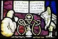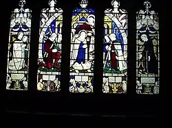 The stained glass in the windows of the south aisle depicts the eleven apostles without Judas Iscariot. They were donated in the middle of the 19th century by the Stubbs family, industrialists in Warrington.[5] The east window of the Daniell chapel includes characters from Alice's Adventures in Wonderland. The window was erected in 1935, following a memorial fund to celebrate the centenary of Carroll's birth. It was designed by Geoffrey Webb and dedicated on 30 June 1935 by Herbert Gresford Jones, Bishop of Warrington. The upper panels depict a nativity scene surmounted by eight angels, and the leftmost panel shows Lewis Carroll himself accompanied by Alice Liddell. The windows incorporate symbolic panels relating to Carroll's life, including the Cheshire wheatsheaf, the arms of Rugby School and Christ Church, Oxford, and mathematical instruments. Across the base of the window are five panels which include characters from the Alice books together with words from Carroll's poem Christmas Greetings. The characters are based on the illustrations by John Tenniel. On the south wall are windows designed by Trena Cox depicting The Flight into Egypt and The Annunciation which were donated to the church in 1960 in memory of the Broome family of Preston-on-the-Hill.[5]