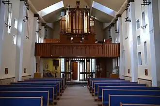 The inner church was completed in 1967 to a design by George Pace.[3] It is of brick construction with a pitched roof. The front is adorned with five medieval heads.