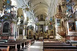 The bell tower is high and massive with elaborate decorations. After a fire in the 18th century, it was restored and finished with a Rococo-style dome roof. Marcin Knackfus prepared a project for the church's altar. Above the high altar rises another altar reminiscent of a royal throne with a canopy. A belfry was erected and the sculptures in the interior were created in the 18th century. In 1859 the polychrome interior décor was enriched. East of the church lies a square, in which the Convent of the Barefoot Carmelites once stood alongside a Baroque Church of St. Joseph the Betrothed established in 1638 by the Vice-Chancellor of the Grand Duchy of Lithuania Stephen Pac. Its exterior was reminiscent of the Church of St. Theresa, Vilnius.[2] In 1877 the Church of St. Joseph the Betrothed was demolished by the tsar's order, to be replaced by a market (presently it is a square).