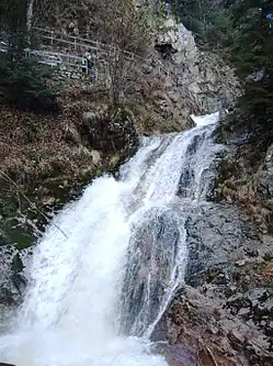 The All Saints Waterfalls (German: Allerheiligen-Wasserfälle) are located in the Black Forest on the territory of the town of Oppenau in the German state of Baden-Württemberg at an elevation of about 500 m above NN. The Lierbach stream, also called the Grindenbach, cascades, as a natural waterfall, down seven steps, a total drop of 83 metres. Due to the scouring of the rocks under the cataract which have formed basin-like holes known as Gumpen or kolks), the falls are also called the Büttensteiner Waterfalls ("Tub Stone" waterfalls) or Sieben Bütten ("Seven Tubs").