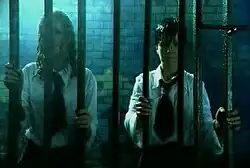 The bridge section has the girls lying in water while snow starts to fall. At the last portion of the chorus, t.A.T.u. are portrayed pointing in different directions, until they both walk around corner and see a vast field, where the sun is breaking out of the clouds; they clasp hands and walk off into the distance. The people on the other side of the fence are left in an eerie green light with rain falling steadily; it is also revealed that they are the ones isolated behind the fence. The video's final scene shows the girls walking further in the distance.[64] Several frames from "Ya Soshla s Uma" did not appear in the visual for "All the Things She Said" due to lip-syncing problems.[65]