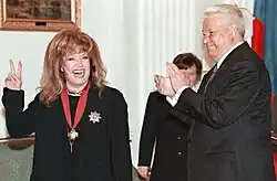 She became a People's Artist of the USSR in 1991, a Laureate of the State Prize of the Russian Federation in 1995. In addition to state awards, Pugacheva was awarded regional and international music prizes. She has received awards in several countries around the world, including the United States, Germany, Finland, Poland, Bulgaria, Ukraine, Belarus, Azerbaijan, Armenia and the Ampex Golden Reel Award, among others. Pugacheva was recognized as the best singer of the 20th century in Eastern Europe by the ZD Awards, named a living legend and the best performer of the 1990s decade by the Ovation Award.[31] In 2017, she was included in the list of "100 most influential Russians of the century" according to Forbes, along with Mikhail Gorbachev, Yuri Gagarin and Pavel Durov.[32] In 2022, she was among three Russian women included in the BBC's 100 Women list.[33][34] Pugacheva was inducted into the Top Hit Music Awards Hall of Fame.[35] For several decades, Pugacheva had the largest fee among performers in Eastern Europe.[36] Due to her many years of popularity in Eastern Europe and Central Asia, Pugacheva was compared by the media to Madonna, and she received the nickname Russian Madonna.[37][38][39]