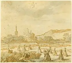Molijn wielded his own influence on his gifted disciple, but the school of landscape painters in Haarlem brought forth many young, talented artists who incorporated the tonal qualities of van Goyen. This can be seen in the development of Isaac van Ostade, who abandoned the genre techniques of his brother Adriaen van Ostade for the broader landscapes of the Ruisdael family. In Utrecht Allert would have also met Savery's nephew and namesake, the landscape artist and engraver Roelant Roghman, who probably returned with him on his trips to Alkmaar, where he made many prints.[4] Alkmaar, itself a busy trading place near Texel island, had little of the picturesque for an artist except polders and dunes or waves and sky. Accordingly, we find Allaert at first a painter of coast scenery. But on one of his expeditions he is said to have been cast ashore in Norway, and during the repairs of his ship he visited the inland valleys, and thus gave a new course to his art.[3]