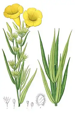 Plants of the genus are evergreen trees,[3] shrubs, or vines. They contain a white latex. The leaves are opposite or arranged in whorls of up to 5. The blades are generally oval and smooth-edged, and some are leathery or lightly hairy. The inflorescence is a compound cyme. The flower has five lobed sepals and a bell- or funnel-shaped corolla of five petals, yellow in most species. The fruit is a schizocarp containing two to four seeds.[3]