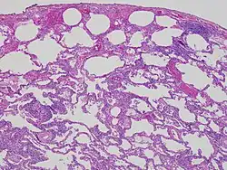 | High magnification photomicrograph of a lung biopsy taken showing chronic hypersensitivity pneumonitis (H&E), showing mild thickening of the walls of the small air sacs by invasion of white blood cells. A multinucleated giant cell, seen within the walls of the air sacs to the right of the picture halfway down, is an important clue to the correct diagnosis. | |