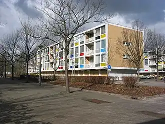 Two of Warner's most renowned buildings are the large and small 'Paintbox' (nl: Verfdos); two residential buildings in the Slotermeer area of Amsterdam.[4] At the time of their opening in 1956, the buildings created much interest nationally and internationally; more than 10,000 visitors came to see the buildings. Of particular interest was the colour scheme and deployment on the facade (designed by the Belgian artist Joseph Ongenae) and with long living rooms with windows at both ends that allowed sun to shine in the morning and afternoon.[5]