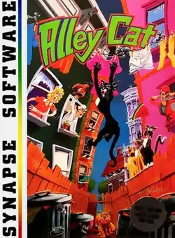 Alley Cat is a video game created by Bill Williams and published by Synapse Software for Atari 8-bit computers in 1983. The player controls Freddy the Cat, who enters people's homes through open windows to perform various tasks in order to reach his love, Felicia.[1] A port for the IBM PC as a self-booting disk and the IBM PCjr were published in 1984 by IBM. These use four-color CGA graphics.