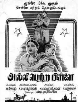 Alli Petra Pillai (transl. The son of Alli)[1] is a 1959 Indian Tamil-language drama film directed by K. Somu and written by A. P. Nagarajan. Produced by A. Maruthakasi, K. V. Mahadevan, Violin Mahadevan and V. K. Muthuramalingam, the film stars S. S. Rajendran, S. V. Sahasranamam, M. N. Rajam and Pandari Bai. It is a remake of the Hindi film Tonga-wali (1955).[2] Cinematography was handled V. K. Gopanna, and editing by T. V. Jayarangan. The film was released on 31 July 1959, and failed at the box office.