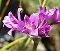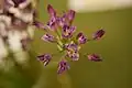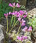 Allium crispum grows from a bulb one to one and a half centimeters wide and sends up naked green stems topped with inflorescences of many flowers, each on a short pedicel. The flowers are magenta in color and have six triangular tepals. The inner three tepals are smaller and crinkled like cloth and may curl under. Anthers and pollen are yellow.[3][5][6] The leaves are narrow and linear, typically slightly shorter than the stems and about 1.5 millimeters wide.[7]