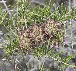 Allocasuarina thuyoides is a monoecious or dioecious, intricately branched shrub that typically grows to a height of 0.3–2 m (1 ft 0 in – 6 ft 7 in). Its branchlets are up to 30 mm (1.2 in) long, the leaves reduced to erect, scale-like teeth 0.4–0.5 mm (0.016–0.020 in) long, arranged in whorls of five or six around the needle-like branchlets. The sections of branchlet between the leaf whorls are mostly 1–3 mm (0.039–0.118 in) long, 0.3–0.5 mm (0.012–0.020 in) wide. Male flowers are arranged in whorls of up to four 1–5 mm (0.039–0.197 in) long on the ends of branchlets, the anthers 0.4–0.6 mm (0.016–0.024 in) long. Female cones are on slender peduncles 2–7 mm (0.079–0.276 in) long, the mature cones shortly cylindrical to spherical, 8–20 mm (0.31–0.79 in) long and 8–15 mm (0.31–0.59 in) in diameter containing winged seeds 5.0–6.0 mm (0.20–0.24 in) long.[2][3]