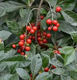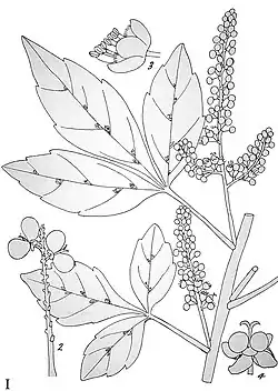 It has a pale grey bark and glabrous, trifoliolate leaves, which may be deeply to shallow lobed. Its fragrant flowers are small and whitish in clusters of three in dense axillary racemes up to 6 cm, or in 2-3 branched panicles, the fertile flowers being few in a panicle, otherwise male. Sepals greenish-white glabrous, petals as long as the sepals, fringed; stamens longer, filaments hairy at the base. Fruit of 2 cocci or 1 by abortion. Fruit is near-spherical and some 6 mm in diameter, maturing to bright red. Wood white, close-grained and hard.[2][3]