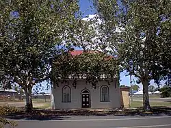 St Paul's Church of England in Back Plains was dedicated on 12 February 1892 by Archbishop of Brisbane William Webber. The last service was conducted in Back Plains on 8 August 1943. In 1953 the church building was relocated to Nobby where it was re-established as St Paul's Church of England.[37] The last service at Nobby was conducted circa 11 May 1975. In 1979 the building was relocated to 12 Jubb Street, Allora (28°01′51″S 151°58′54″E / 28.0309°S 151.9818°E) to become the Scots Presbyterian Church for those Presbyterians in the district who did not wish to become part of the Uniting Church of Australia. The church in Allora was dedicated on 26 July 1980 by Presbyterian Moderator Rt Rev F. White.[38][39] From 1949 to 1956, the Allora Cup was held at Allora Racecourse, located near the town. These events drew large crowds.