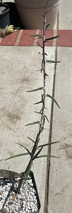 This is a succulent shrub that usually grows 1.5–2 meters tall that will lose its succulent leaves in the winter. Will branch, and has a white stem with thorns. It is one of two species in the Alluaudiopsis genus.[1]