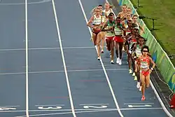 At the 2016 Summer Olympics held in August in Rio de Janeiro, Almaz set a world record of 29:17.45 in the 10,000 metres, topping Chinese athlete Wang Junxia's 23-year-old world record by 14 seconds.[19][20] No one previously had run within 22 seconds of Wang's record.[21] The 10,000 metres was already an extremely fast race when Ayana broke away with 12 laps to go. Second-placed Vivian Cheruiyot of Kenya finished just a second shy of Wang's record and double Olympic 10,000 metres champion Tirunesh Dibaba earned the bronze medal with a 12 seconds improvement on her personal best and the fourth fastest time in history. Multiple national records were set, and eighteen competitors set personal bests.[22] The lax drug testing regime in Ethiopia[23] and the doping scandals that embroiled athletics before the Rio Olympics caused some to question whether Almaz had been doping.[24] British commentators Brendan Foster and Paula Radcliffe, both former world record holders in distance events, were skeptical about Almaz's performance.[20] Fellow competitors reported that before the race, the Ethiopian was coughing and did not seem well.[25] In her post-race press conference, Almaz said her time was purely the outcome of hard training.[26] On 9 September, in her first race since the Olympics, Almaz attempted to break Tirunesh Dibaba's 2008 5000 m world record of 14:11.15 at the Brussels Diamond League.[27] Despite a strong start, she fell short of breaking the record but did set a meeting record of 14:18.99.[28]