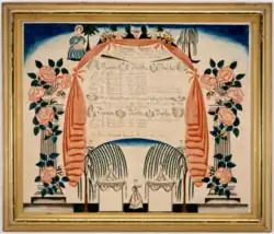 In 1841, unmarried, Edson joined the religious community in Putney, Vermont founded by John Humphrey Noyes. There she fell in love with another community member, John R. Lyvere. The couple asked Noyes for permission to marry, but he refused; consequently, while he was away the pair eloped to Hinsdale, New Hampshire, where they wed on September 18, 1842. Noyes banished them upon hearing of their disobedience, and they moved to Vernon, Connecticut, where Edson remained until her death.[1] Her last known register, for William C. and Emily Porter Russell, was painted around 1847 in Ellington, Connecticut, near Vernon.[1] Little else is known of her life, although she was the subject of research by collectors Arthur and Sybil Kern.[2][3]