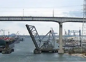 ![]() View from the Danziger Bridge looking riverwards, with the large I-10 highrise bridge and the smaller Almonaster Avenue Bridge in raised position below and behind it. | |