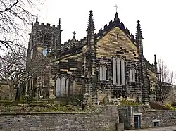 The village is close to Castle Hill, Huddersfield's most prominent landmark. Almondbury has several notable buildings, including the 16th-century Wormald's Hall,[3] now the village Conservative club, and the Grade I listed All Hallows Church.[4] The church is mainly Perpendicular in style but the chancel is earlier. The roofs have a long inscription dated 1522 on the cornice. Other wooden furniture of interest includes a Georgian lectern, a pew of 1605 and a late Perpendicular font cover.[5]