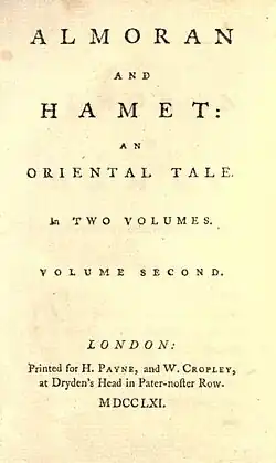 Almoran and Hamet is a 1761 novel by the British writer John Hawkesworth, published in two volumes. Inspired by the style of Samuel Johnson's Rasselas it ran through six editions by 1796.[1] Following the death of their father, two brother battle for the Persian throne.