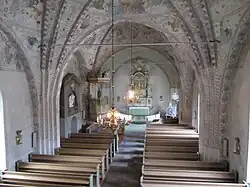 Of the furnishings, the baptismal font dates to the medieval era. The altarpiece and the pulpit both date from the early 18th century. Both feature gold baroque trimming by German-Swedish sculptor Burchard Precht (1651–1738).[3][5][6]