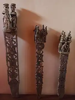 The aloalo is a funerary pole sculpture that, along with the skulls of slaughtered zebu, is placed on the tombs of important people in the south-western region of Madagascar. Originally, aloalos were only available for wealthy individuals, but later the wealthy could purchase them. The memorial may help the deceased to join the community of ancestors, since the word alo means 'intermediary' or 'messenger' in Malagasy. These carved posts often tell the story of the person's life and generally take the form of a series of geometric or symbolic shapes topped by sculpted figures or objects evocative of the deceased's life, or desirable material possessions. The zebu represents prosperity and the aloalo usually has a combination of nude human figures and birds. They are chiefly associated with the Mahafaly people,[1][2] although they are also found on the tombs of some Antandroy and particularly the Sakalava, whose carved figures are reputed for their often erotic imagery.[3]