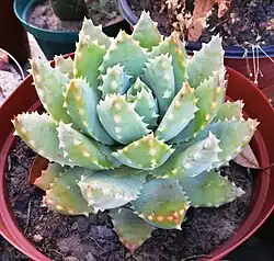 Though only 10 cm in height,[4] the Kleinaalwyn tends to sprout suckers from its sides that become new rosettes. Consequently, it can form large clumps. The leaves are short and fat and edged with soft, harmless, white teeth. In fact, the name "brevifolia" means "short-leaf" in Latin.[5] The plant is also distinctive for its gray-blue colour.
