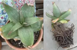 Leaves in rosette, and has white stripes very simlair to Aloe karabergensis. Leaves not as meaty as Aloe karabergensis. Plants that are mature can get to about 1 meter in diameter. [3]
