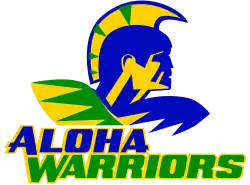 The community of Aloha (pronounced Ah-LO-wa) was likely named for a place in the state of Wisconsin, and not for the Hawaiian word aloha.[5] The association with Hawaii, however, gives the school its mascot, a Hawaiian warrior, and the design of the school crest, which includes a warrior and a conch shell, a symbol associated with Hawaii.[4] The crest was designed by students during the 1968–69 and 1969–1970 school years.[4]