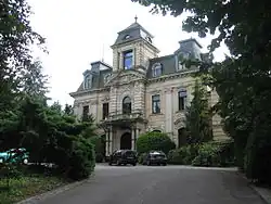 In 1891-1893 the Elberfeld banker Baron Karl von der Heydt commissioned the "Castle on the Juniper" by the architect Heinrich Plange[7] in neoclassical architecture and gave it the name "Stella Rheni" (Latin for "Star of the Rhine"). From this strictly geometrical building in yellow sandstone, you can enjoy a view over the Rhine valley and Siebengebirge. Walter von Engelhardt who also landscaped Charlottenburg laid out the extensive park. Since 1927, the Jesuit Villa has been used as a boarding school for young and middle-class boys.