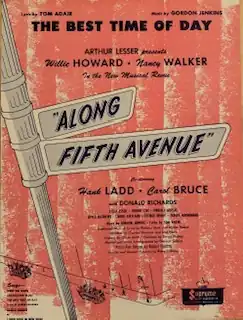 Along Fifth Avenue premiered on Broadway at Broadhurst Theatre on January 13, 1949, moved to the Imperial Theatre in February, and closed on June 18, 1949, after 180 performances.[1][5] The opening night cast starred Nancy Walker, Carol Bruce, Jackie Gleason and Hank Ladd.[6] The show was produced by Arthur Lesser. The musical staging was by Robert Sidney, with additional direction by Charles Friedman. The scenic design was by Oliver Smith, with costume design by David Ffolkes and lighting design by Peggy Clark.[1] Willie Howard died on January 14, 1949, the day after the show opened in New York, at the age of 62.[7]