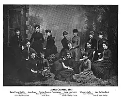 In the fall of 1885, James Hamilton Howe, the first dean of the Music School at DePauw University in Greencastle, Indiana, invited seven women from the school to a meeting to form a fraternity.[2][3] Those women were Anna Allen Smith, Olive Burnett Clark, Bertha Deniston Cunningham, Amy DuBois Rieth, Nellie Gamble Childe, Bessie Grooms Keenan, and Estelle Leonard.[2] Alpha Chi Omega was formed on October 15, 1885.[2][3]
